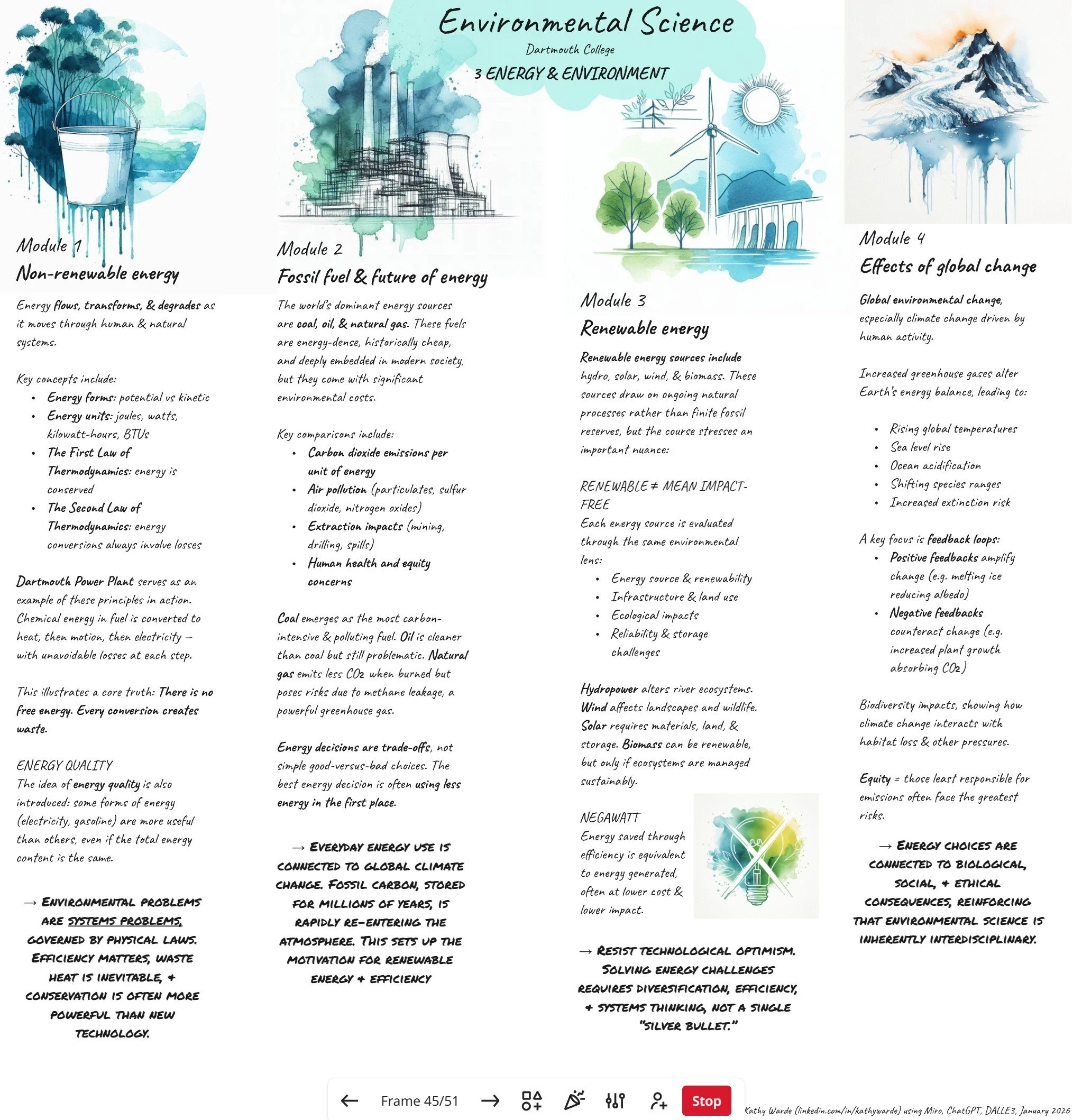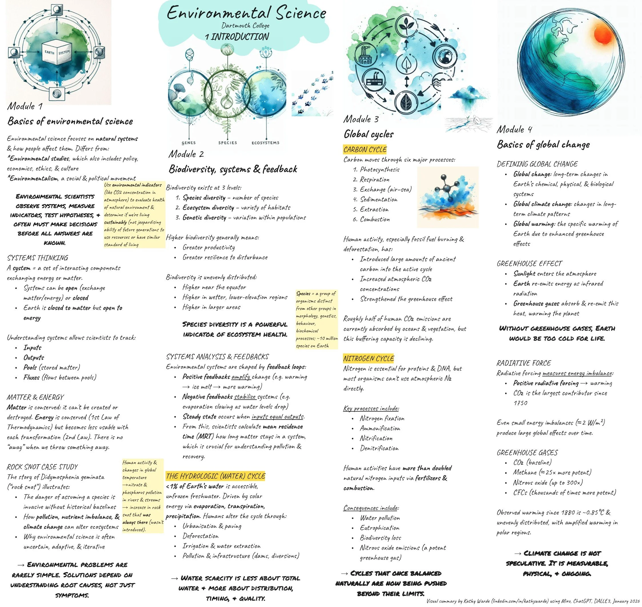 These visual summaries capture notes from an Environmental Science course offered by Dartmouth, which I completed recently through Coursera.