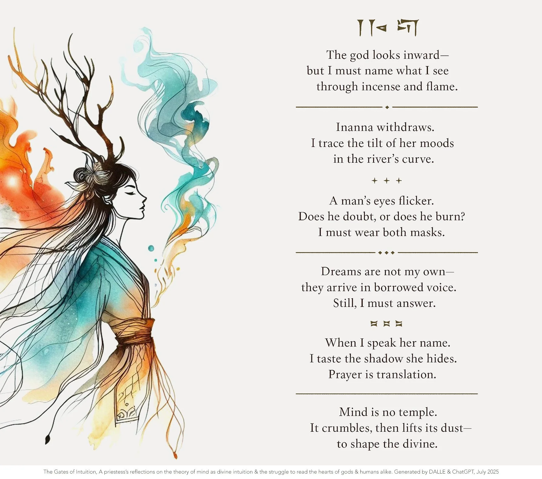 Here is a series of haikus imagined in the voice of Enheduanna—high priestess, poet, daughter of Sargon, and the first known author in recorded history. Writing from the sacred ziggurat, she speaks of theory of mind not as modern science, but as divine intuition, emotional nuance, and the struggle to read the hearts of gods and humans alike.